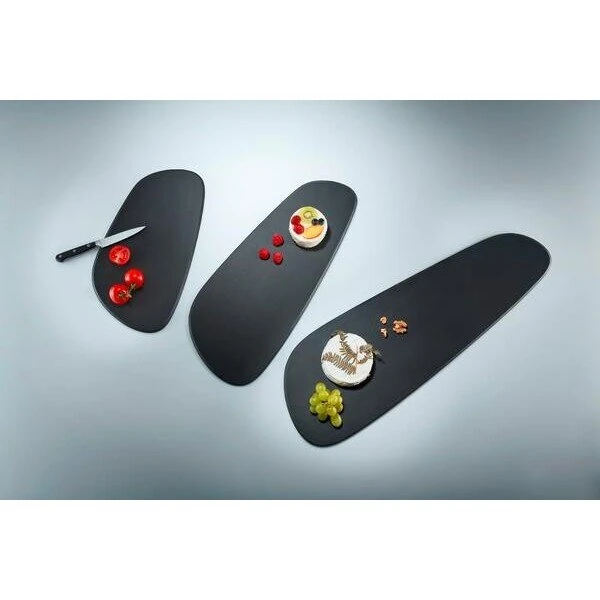 Das schwarze Schneidebrett Duracore von Continenta behandelt Ihre Messer schonend, ist aber zeitgleich als Fundament für Ihre Schneidearbeiten stabil und belastbar. Diese hohe Funktionalität wird mit einer charmanten Formgebung, die an einen Kieselstein erinnert, abgeschlossen.